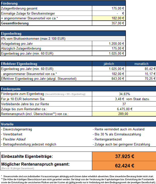 Grundlage der Berechnung ist eine fondsgebundene Riesterrente mit einer Annahme von 3 % Wertentwicklung nach Kosten.